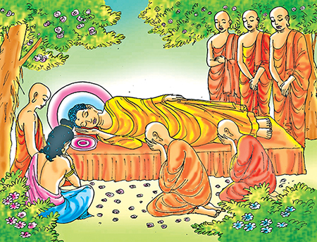 කළ හ. මල්ල රජදරුවන් ගේ උපවත්තන සල්උයන තුළ සල් ගස් දෙකක් අතර අනඳ තෙරුන් විසින්
