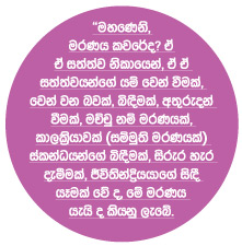 “කතමඤ්ච භික්ඛවෙ, මරණං යා තෙසං තෙසං සත්තානං තම්හා තම්හා සත්තනිකායා චුති වචනතා භෙදො අන්තරධානං මච්චුමරණං කාලකිරියා ඛන්ධානං භෙදො කලෙබරස්ස නික්ඛෙපො ජීවිතින්ද්‍රියස්ස උපච්ඡෙදො ඉදං වුච්චති මරණං ඉති අයඤ්ච ජරා ඉදඤ්ච මරණං ඉදං වුච්චති භික්ඛවෙ ජරා මරණං”