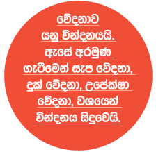 වේදනාව යනු වින්දනය යි. ඇසේ අරමුණූ ගැටීමෙන් සැප වේදනා, දුක් වේදනා, උපේක්ෂා වේදනා, වශයෙන් වින්දනය සිදුවෙයි. කනෙහි ශබ්දය අරමුණ ගැටීමෙන් සැප වේදනා, දුක්වේදනා, උපේක්ෂා වේදනා සිදුවෙයි. නාසයෙහි ගන්ධ අරමුණු ගැටීමෙන් සැප වේදනා, දුක් වේදනා, උපේක්ෂා වේදනා, සිදුවෙයි. දිවෙහි රස අරමුණු ගැටීමෙන් සැප වේදනා, දුක්වේදනා, උපේක්ෂා වේදනා හටගනියි. ශරීරයේ ස්පර්ශය අරමුණු ගැටීමෙන් සැප වේදනා, දුක් වේදනා, උපේක්ෂා වේදනා සිදුවෙයි. මනසෙහි අරමුණූ ගැටීමෙන් සැප වේදනා, දුක් වේදනා, උපේක්ෂා වේදනා, සිදුවෙයි. මෙසේ හය ආකාරයකින් වේදනා සිදුවෙයි.