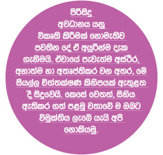 සිහිය, තේරුම් ගැනීමට කිසිවක් එකතු කිරීම හෝ එයින් කිසිවක් අතහැරීමක් නො කරයි. විකෘති කිරීමක් නැත. පිරිසිදු අවධානයෙන් පැමිණෙන සියල්ල නිරීක්ෂණය කරයි. සිතිවිලි අප ව අදහස් හා සංකල්පවලින් පුරවයි.