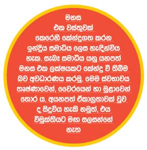 මනස එක වස්තුවක් කෙරෙහි කේන්ද්‍රගත කරන ඉන්ද්‍රිය සමාධිය ලෙස හැඳීන්විය හැක. සැබෑ සමාධිය යනු යහපත් මනස එක ලක්ෂ්‍යයකට කේන්ද්‍ර වී තිබීම බව අවධාරණය කරමු. මෙම ස්වභාවය තෘෂ්ණාවෙන්, වෛරයෙන් හා මුළාවෙන් තොර ය. අයහපත් ඒකාග්‍රතාවක් වුව ද සිදුවිය හැකි නමුත්, එය විමුක්තියට මඟ සලසන්නේ නැත. කාම ආශාව කෙරෙහි ඔබගේ මනස මනාව ඒකාග්‍රවී තිබිය හැක. නමුත් එයින් ප්‍රයෝජනයක් නැත. ඔබ ද්වේශ කරන දෙයක් කෙරෙහි ඒකාග්‍ර වූ මනස උපකාරී නොවෙයි. එවන් ඒකාග්‍ර මනසක්, විශේෂයෙන් ඔබ තව කෙනකුට හිංසාවක් කිරීමට යොදාගන්නා විට, එය ඉතා කෙටි කාලයක් පවතින තත්ත්වයකි. සැබෑ සමාධිය එවන් දූෂිත බවෙන් තොර වෙයි. එය මනස එක් තැන්වීමේ ක්‍රමයක් බැවින් බලය හා ශක්තිය ලබා ගනී. මෙය කාචයකට සමාන කළ හැක. කඩදාසියක් මතට වැටෙන සාමාන්‍ය හිරු එළිය කඩදාසිය උණුසුම් කිරීමට වඩා දෙයක් නො කරයි. නමුත්, එම හිරුඑළිය ප්‍රමාණයම කාචයක් තුළින් ඒක කේන්ද්‍රික වී පතිතවන විට කඩදාසි කොළය ගිනි ගනියි. සමාධිය කාචයයි. මනසේ ගැඹුරු ස්ථාන දැකිය හැකි වන තරම් ප්‍රබලත්වයක් එය නිපදවයි. කේන්ද්‍ර කර ගත යුතු වස්තුව තෝරා ගන්නා සිහිය කාචය තුළින් එහි තිබෙන දේ නිරීක්ෂණය කරයි.