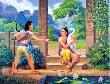 දේවදත්ත, සිදුහත් සහ යශෝධරා මාලිගා අංගණයේ ක්රීඩා කරමින් සිටියහ. පන්දුව අංගණයෙන්