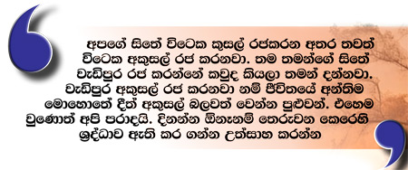 අකුසලය මේ ජීවිතයට ලොකු බරක්. ජයග්රහණයක් ලබන්නට කැමැති කෙනා කෙලෙස් දුරු කරන්න