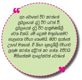 මිනිසකු වශයෙන් සම්පූර්ණ කළ යුතු අවම ගුණය වත් ඔබ සම්පූර්ණ කරලා නැත්නම් ඔබ උතුම් මිනිසකු වන්නේ නෑ. මිනිස්කම නැති වූ තැන ඔබ මේ ලෝකෙ සිටින නරකම සත්ත්වයා බවට පත් වන බව අමතක කරන්න එපා.