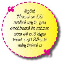 ඒ උතුම් සීලය නිරතුරුව ම මම ආරක්ෂා කරමි. සංසාර දුකින් මිදීම පිණිසම අවබෝධයෙන්ම