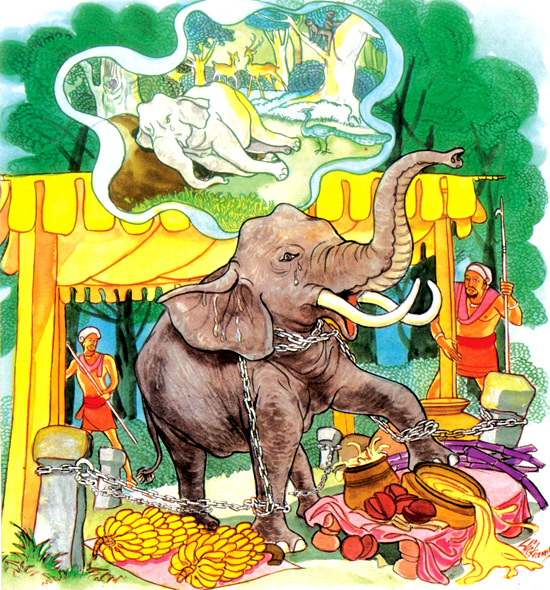 ධනපාලකො නාම කුඤ්ජරො - කටුකප්පභෙදනො දුන්නිවාරයො බද්ධෝ කබලං න භුඤජති - සු’මරති - නාගවනසස කුඤ්ජරො, මහ ඇත් දනපාලක සැඩ වන්නේ - බැඳුනේ හේ කිසිවක් නොබු දින්නේ - රස අහර ද කිසිවක් නොම ගන්නේ - මව සිටිනා වනය ම සමරන්නේ. සැවැත් නුවර ඉසුරුමත් මහලු බමුණෙක් විසී ය. ඔහුට පුත්තු සතර දෙනෙක් සිටියහ. පුතුන් සතර දෙනට කුමරියන් සිවු දෙනකුන් සරණ කර දුන්නේ ය. බැමිණිය මළ පසු පුත්තු සතර දෙනා ද, යෙහෙළණියන් සතර දෙනා ද බමුණා වට කරගෙන උවටැන් කළහ. දිනක් ඔවුහු පියාගේ අත් පා මෙහෙවර කරමින් සිටියදී ම ‘පියතුමනි, අපි ඔබට සැප එළවන්නෙමු. අපට ධනය බෙදා දී ඔබ සිත සනසා ගන්න යැයි කියා කීහ. මේ කතාවට බමුණා ද රැවටුණේ ය. සිත මොළොක් වූයේ ය. ධනය ද සතර දෙනාට සම ව බෙදා දුන්නේ ය. මඳ කලක් ගිය පසු පුත්තු නොසලකා හැරියා හ. කිසිවකුගේ පිළිසරණක් නොලැබුණේ ය. බමුණා බුදුරදුන් වෙත යාමට සිතුවේ ය. ඒ බමුණා, "බුදුරජාණන් වහන්සේ සියලු දෙනා සමඟ මෙත් සිතින් කතා කෙරෙති. යහපත සලසති. උවදෙස් දෙති"යි අසා බුදුරදුන් ඉදිරියට පැමිණියේ ය. සිරුර බල නැති ව පසෙක හිඳ ගත්තේ ය.