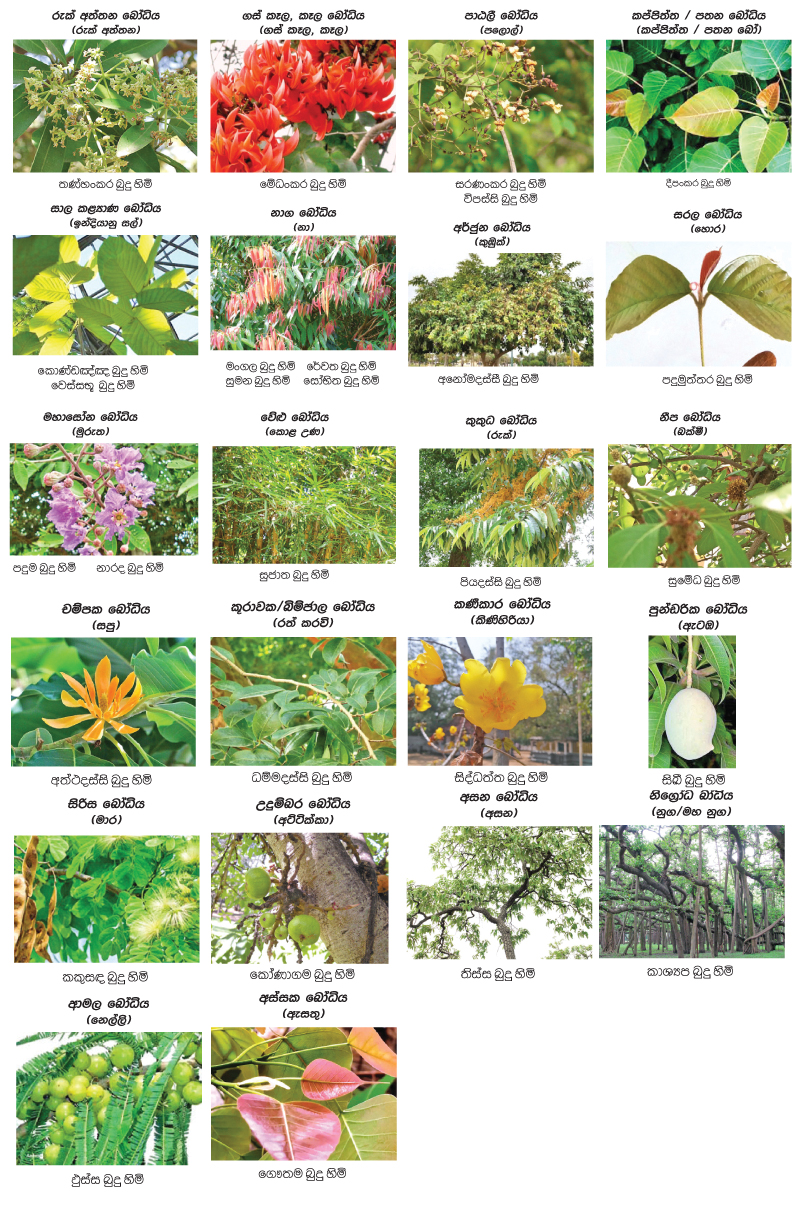 හොර හෙවත් සලල ගස ද, කොළොන්, මහානිප, නීපරුක්ඛ නම්වලින් යුතු බක්මී ගස ද, මහාවේණු, වේළු යනුවෙන් හදුන්වන කොළ උණ ගස ද, කුකුබ, පියංගු නමින් හදුන්වන රුක් ගස ද, චම්පික නමින් හඳුන්වන සපු ගස ද, බිම්බජාල, කුරාවක යනුවෙන් භාවිත කරන රත්කරවු ගස ද, කනීකාර, කරණකාර නම්වලින් දක්වන කිණිහිරියා ගස ද, අසන, පියා යන නම්වලින් හදුන්වන කොහොඹ ගස ද, ආමලක, ඇඹුල රුක යනුවෙන් දක්වන නෙල්ලි ගස ද, පාඨලී හෙවත් පලොල් ගස ද, පුණ්ඩරීක, හෙළඹ නම්වලින් හදුන්වන ඇටඹ ගස ද, උදුම්බර සහ දිඹුල් යනුවෙන් දක්වන අට්ටික්කා ගස ද, නිග්‍රෝධ සහ මහනුග යනුවෙන් හඳුන්වන නුග ගස ද, මහරි, සිරිසි, මාර සංඝ්‍ය නමින් දක්වන මාර ගස ද, අසත්ත බෝධිය නමින් දක්වන ඇසතු බෝධිය ද බෝසත්වරු බුද්ධත්වයට භාවිත කළහ. මේ සියල්ල ඉතා විශාල වෘක්ෂයෝ ය. අධික සෙවණක් සහිත ය. ජලය රැඳෙන ස්ථානවල පිහිටන ඒවා ය. එමෙන් ම ශරීර සෞඛ්‍යයට මහත් සහනයක් සැපයීමේ හැකියාවලින් යුක්ත ය. ඖෂධීය ගුණවලින් පිරිපුන් ය. බුද්ධාංකුරයන් වහන්සේලාගේ අවධානය එම වෘක්ෂවලට යොමු වී ඇත්තේ එවැනි හේතු නිසා ය.